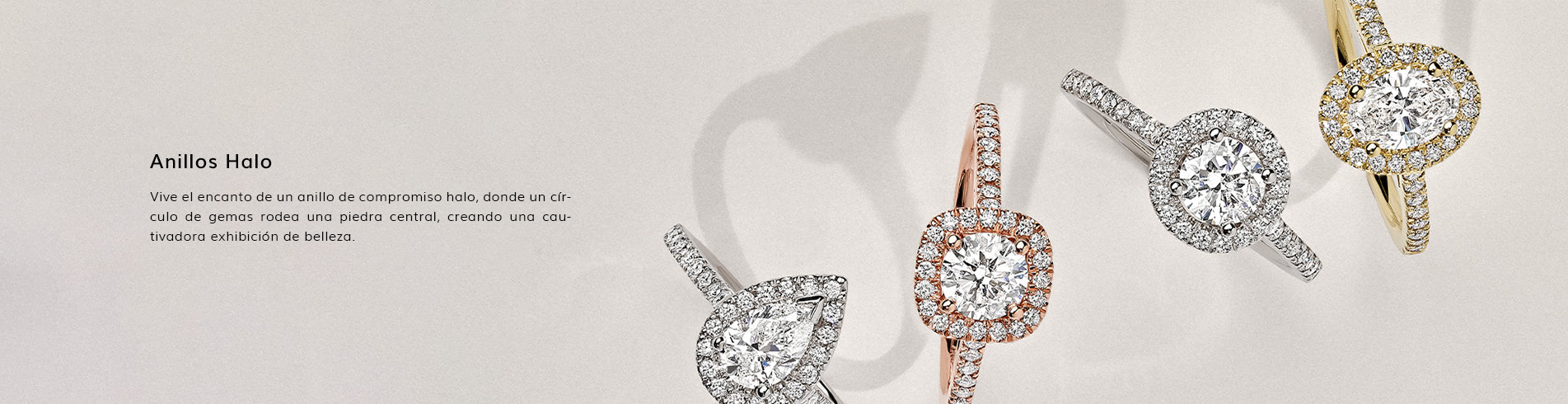 Los anillos de compromiso de halo son una opción popular para muchas personas. Presenta una piedra central completamente rodeada por una o dos líneas de gemas de acento más pequeñas para un brillo adicional. El halo atraerá la mirada hacia la piedra más grande, añadirá más brillo, aumentará el peso en quilates del anillo y mejorará el tamaño visual percibido del diamante, haciendo que todo el anillo se vea más elegante y deslumbrante.